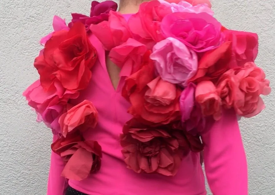 Each and every rose petal been hand cut out of smooth faux silk fabric, hand treated and shaped into a form which allowed me to sew each petal step by step to each other creating a realistic flower head. The underlay top style is long sleeved with round neck made from a bright pink, comfy elastic material suitable for UK sizing 10-12. For further info about exact details and personalised orders please check the below out: